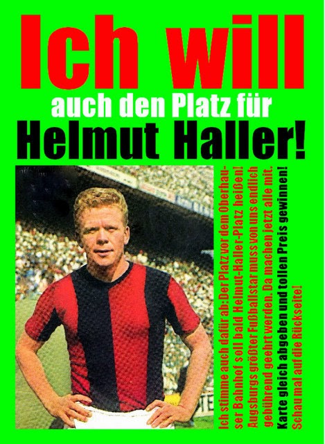 "Die Umbenennung erfolgte nach einer Idee des Augsburger Krimi-Autors Peter Garski. Er hatte mit einigen Mitstreitern eine Kartenaktion gestartet: "Ich wünsch mir den Helmut-Haller-Platz". Der Ball kam ins Rollen. Was folgte war ein Vorschlag der SPD-Fraktion im Stadtrat ..."